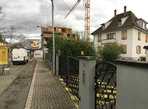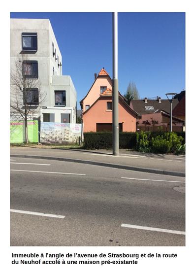 Dans notre lettre ouverte à l’Eurométropole, nous avions énuméré un certain nombre de dysfonctionnements, parmi lesquels la construction d’immeubles 1°) sans aucun retrait par rapport à la voie publique (contrairement à des maisons voisines), et 2°) sans aucun retrait par rapport à la limite séparative (de manière à s’accoler aux maisons voisines et à les écraser). Nous n’avions là encore reçu aucune réponse évoquant des solutions concrètes sur ce point, que ce soit de la part de la présidente de l’Eurométropole, Pia Imbs, de la présidente déléguée, Danielle Dambach, que nous avons rencontrée récemment, ou des maires des communes de l’Eurométropole, à qui notre lettre ouverte était également adressée.